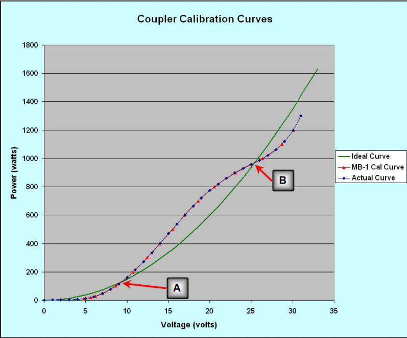 The figure below illustrates how the MB-1 calibration feature can be used to achieve excellent accuracy, even with a coupler that deviates substantially from the ideal.  Three curves are shown. The green curve is a power vs. voltage curve for an ideal coupler. It follows the square law relationship exactly. The blue curve represents the curve for a hypothetical "real world" coupler. It shares two points, A and B, with the ideal coupler, but otherwise deviates substantially from the ideal curve. The deviation from the ideal curve has been exaggerated to challenge the MB-1 calibration routine's ability to track an arbitrary coupler curve, but deviations do exit and can be substantial (see Bird element transfer function for a real world example).