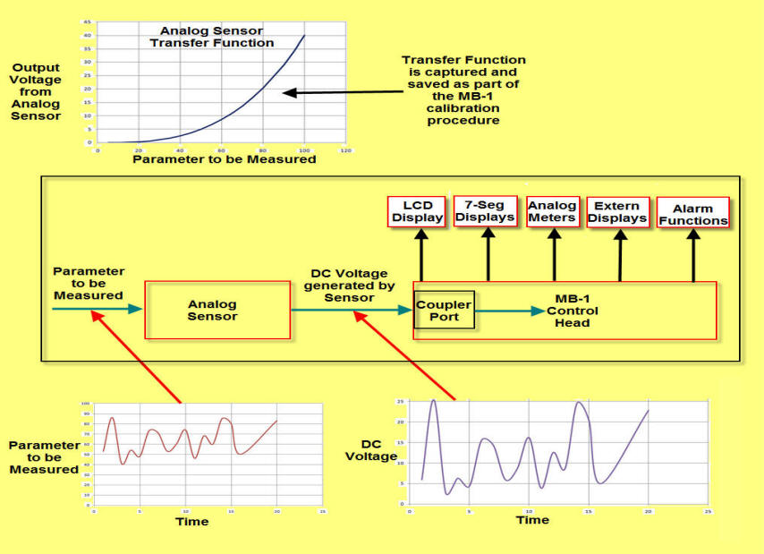 Once calibrated, MB-1 reads the sensor's output voltage and calculates the corresponding value of the parameter being measured. It then outputs the measurement to one or more of MB-1's configurable display devices. In addition to displaying the measurement, the parameter being measured can also be processed by other MB-1 features such as the Min/Max function, the peak capture function, the averaging function, and the alarm trip functions.