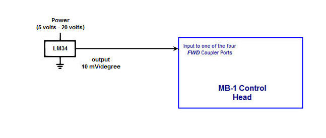 A sample application that uses an inexpensive temperature sensor is shown below. The sensor's output voltage is fed into one of MB-1's coupler ports after that coupler port has been calibrated to convert the voltage output from the sensor to a temperature value. In addition to displaying the temperature on various MB-1s display devices, the temperature is also processed by MB-1's Min/Max feature and alarm feature.