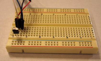 The temperature sensor, a National semiconductor LM34, shown below, and is being powered from MB-1's auxiliary 5 volt supply, which is accessible from two RCA jacks on the rear panel of the meter. The LM34 output is connected to one of MB-1's FWD coupler ports that has been calibrated to measure temperature.