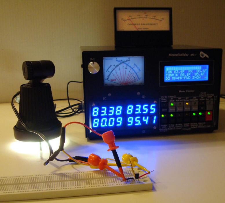 The photo below shows the MB-1 alarm function being used with this temperature application. The high temperature threshold has been set at 85 degrees. The halogen lamp, which serves as a heat source, is wired in series with the normally closed alarm contacts. When the relay trips, the contacts open, removing power from the lamp.