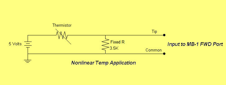 Sparkfun, Pololu, Adafuit, and RobotShop have a number of sensors for a large variety of applications ranging from simple temperature sensors to more exotic sensors such as alcohol gas level sensors, flex sensors, and gyroscopes. Some of these sensors provide a direct DC output voltage that can be fed directly into the coupler port of MB-1. Others change their resistance as the parameter varies. The latter type can be used with MB-1 by placing the sensor in series with a fixed resistor, feeding MB-1 from the voltage divider tap formed by the sensor resistance and the fixed resistance, and powering the series connection from a DC source as shown in a thermistor application in the figure below. Depending upon how the sensor resistance varies with the parameter, the sensor can either be connected between the voltage source and the tap of the fixed resistor (as shown below), or between the tap of the fixed resistor and ground. The choice should be made so that the voltage fed to the MB-1 coupler port increases as the parameter being measured increases.